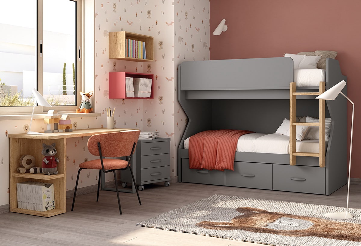 Si quieres un dormitorio todo en uno, existen literas con escritorio incorporado o con cajones en la escalera, ideales para mantener el orden. Son perfectas para habitaciones estrechas donde cada centímetro cuenta.